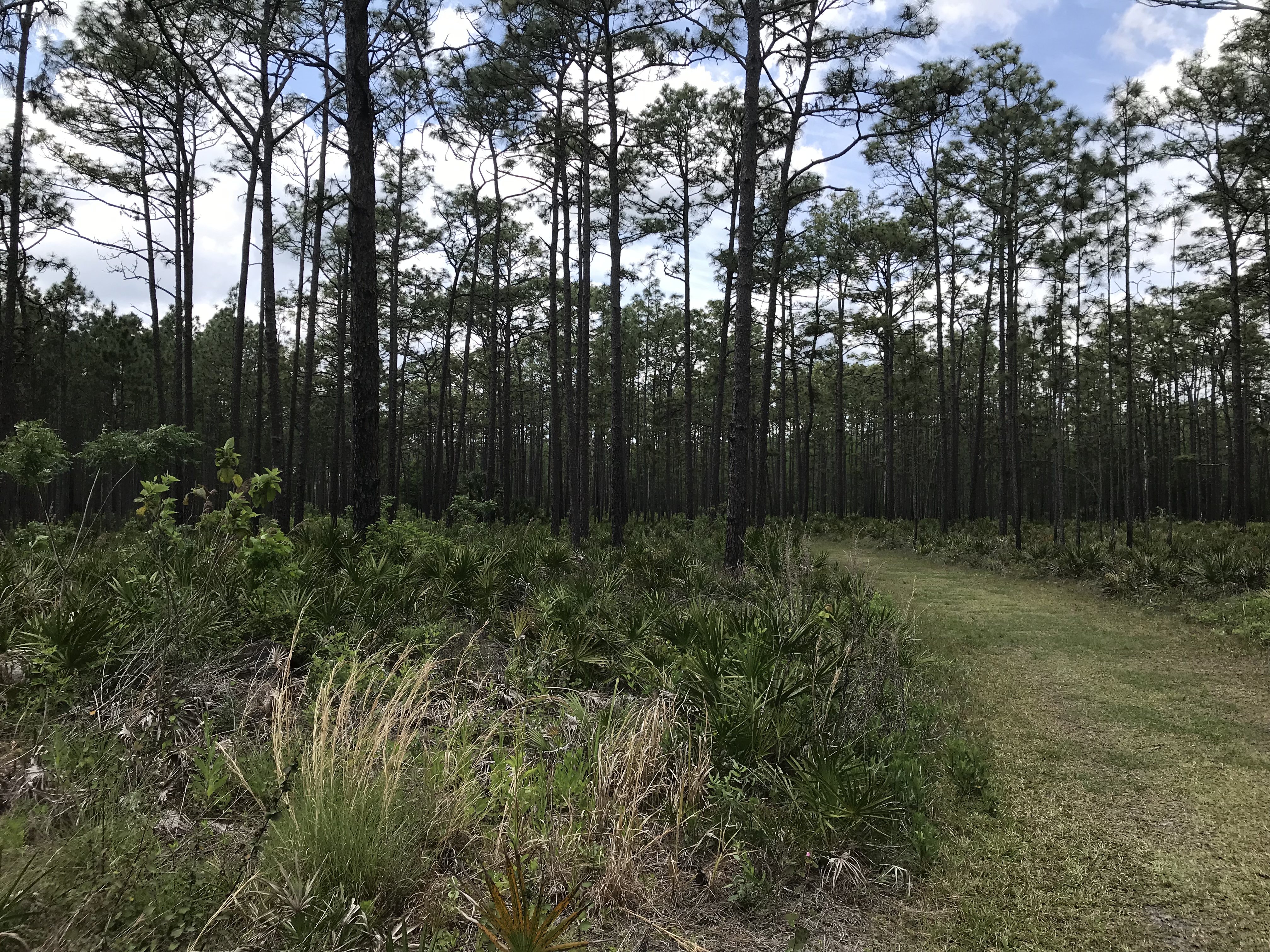 In the afternoon, we went on a hike on one of the many trails in the state park. We took the map provided by the ranger when we checked in. We walked around a lake and into an area of pine and palmetto scrubs where we saw a lot of tilled up ground from the wild hogs rooting. We followed along Colt Creek where we saw an alligator motionlessly submerged under the water. His eyes and snout were peeking above the water’s surface like little periscopes. As we walked along, we soon realized the map we had was not right. A section of the trail we planned on taking to the main road was not there. It had grown over. We had to backtrack a little to avoid adding five more miles to the hike. It was just the two of us out there. We didn’t see another soul for the entire hike. It clouded up and a light rain started for the final half mile of our six mike hike. This was an adventure and I really like getting out and seeing all that nature has.