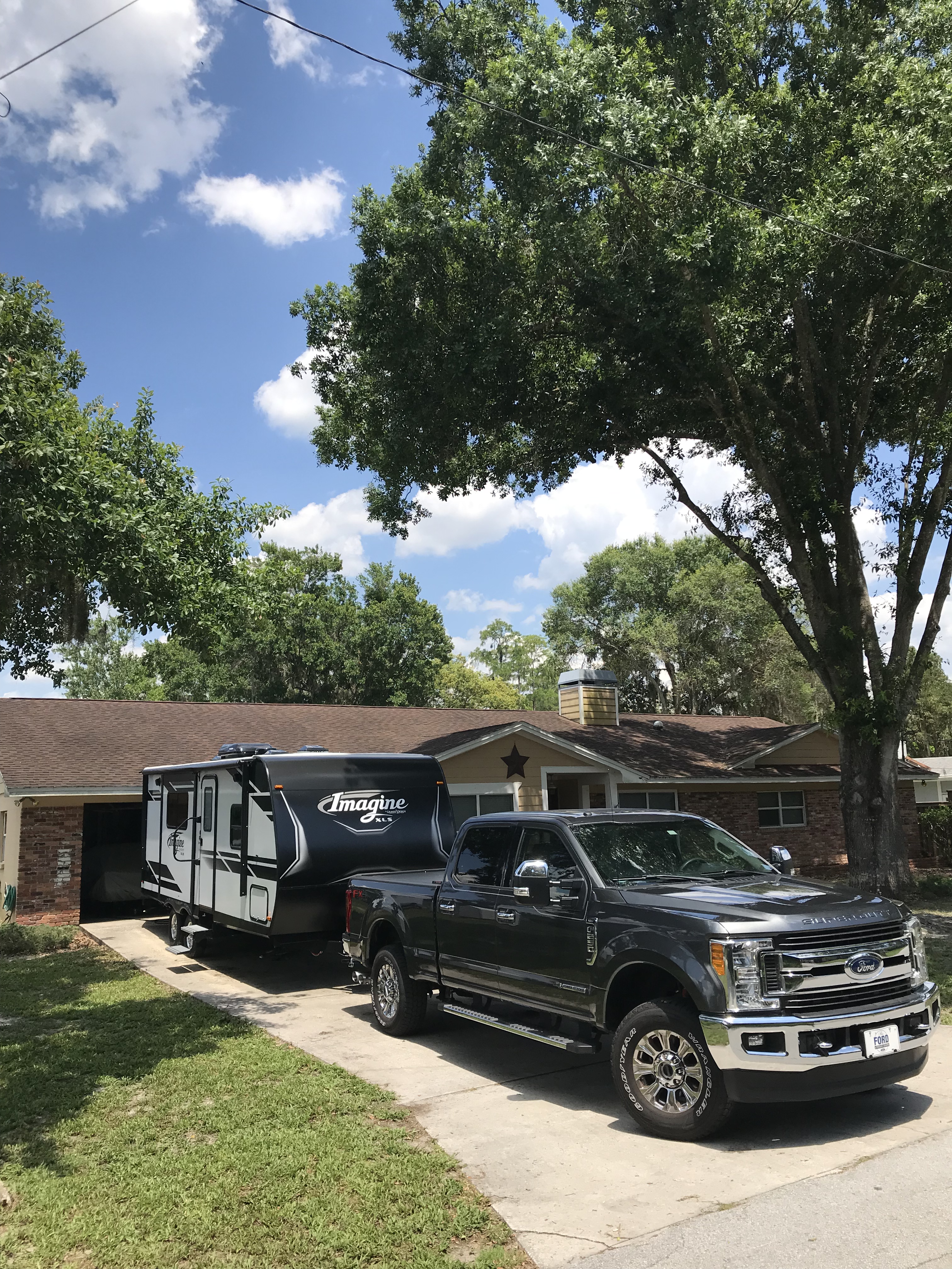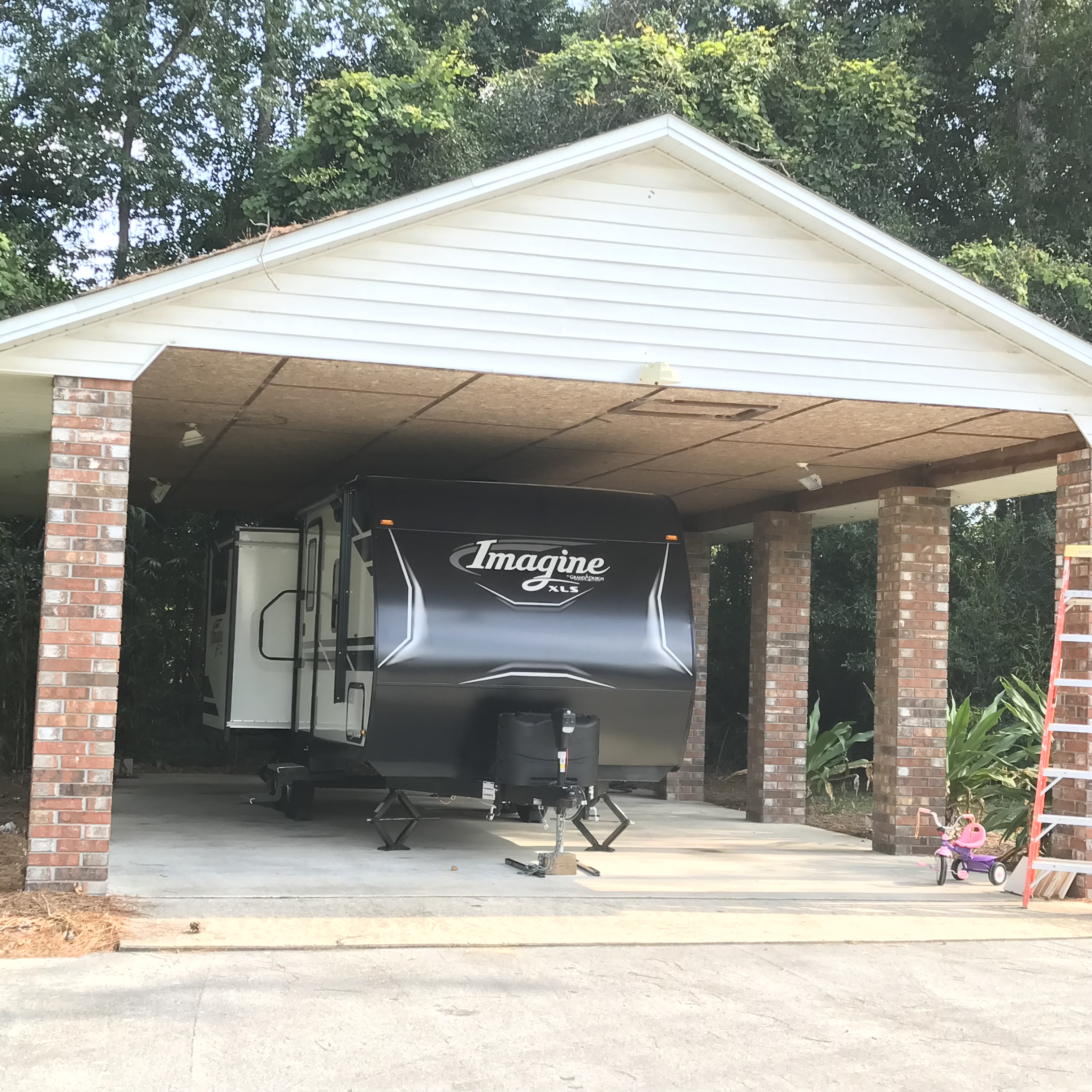 We carefully backed into the carport behind our daughter and son-in-laws’s house for a three night stay. We had about three inches of clearance from the A/C to the ceiling. Perfect…it was almost like it was meant just for us. The carport provided shade to help keep the heat from the Florida sun off the trailer. We filled the fresh water tank and hooked up to a 20 amp outlet. I joked with the kids that the site was so nice we might stay a while. Of course we‘d have to dig a fire pit in the yard.