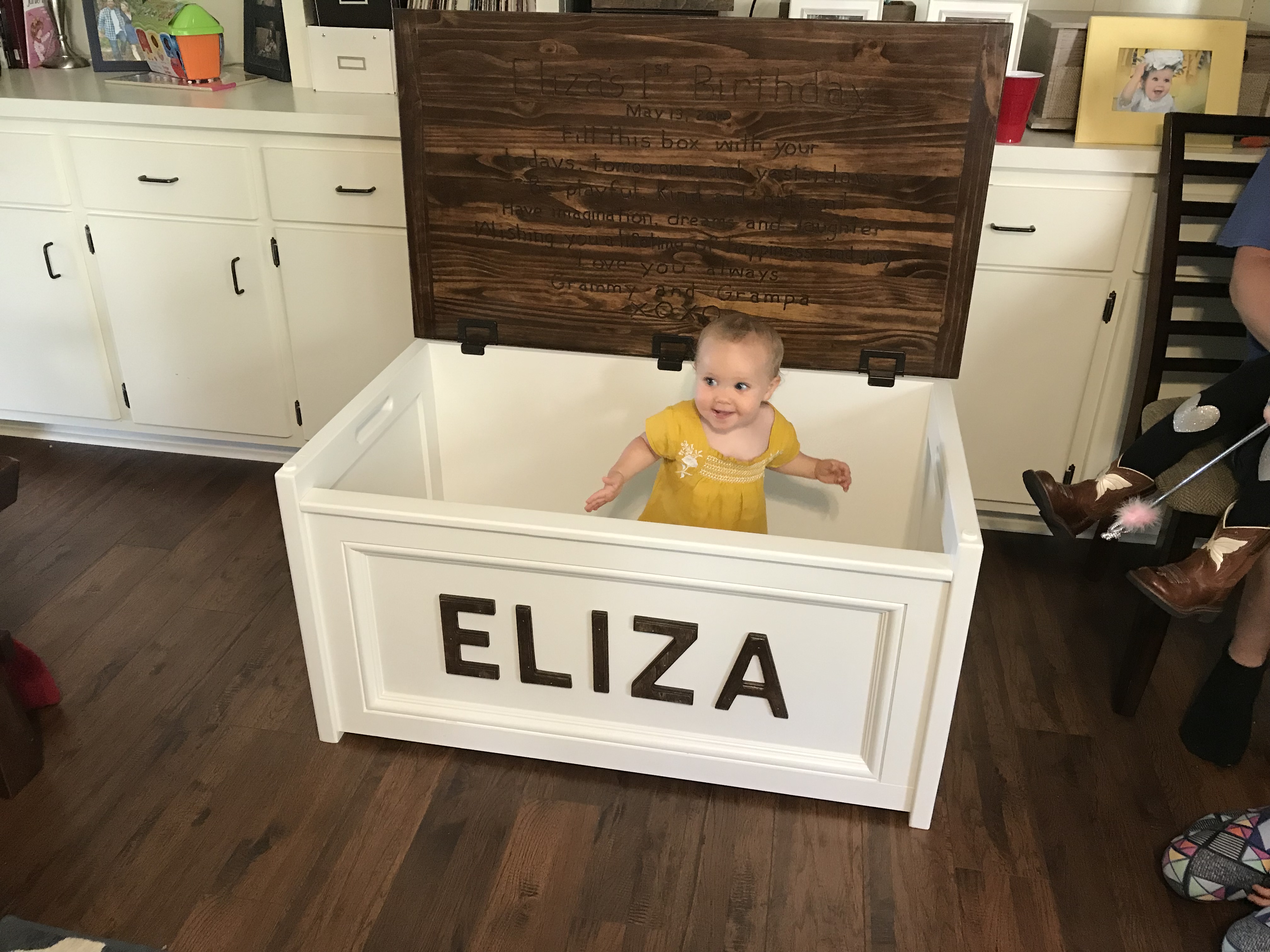 Eliza’s first birthday celebration was a huge success this weekend. Friends and family gathered for an afternoon of good food, birthday cake and boisterous laughter. Joy and an abundance of love filled the air. Eliza was the star. She danced and wiggled, gave hugs and kisses and entertained everyone. Grammi and I gave her the toy box we made in the workshop. I think it was a big hit with her as she climbed inside of it and dance around. It was an exciting but exhausting day for her. After all the guest went home she crashed early and was asleep by six o’clock.