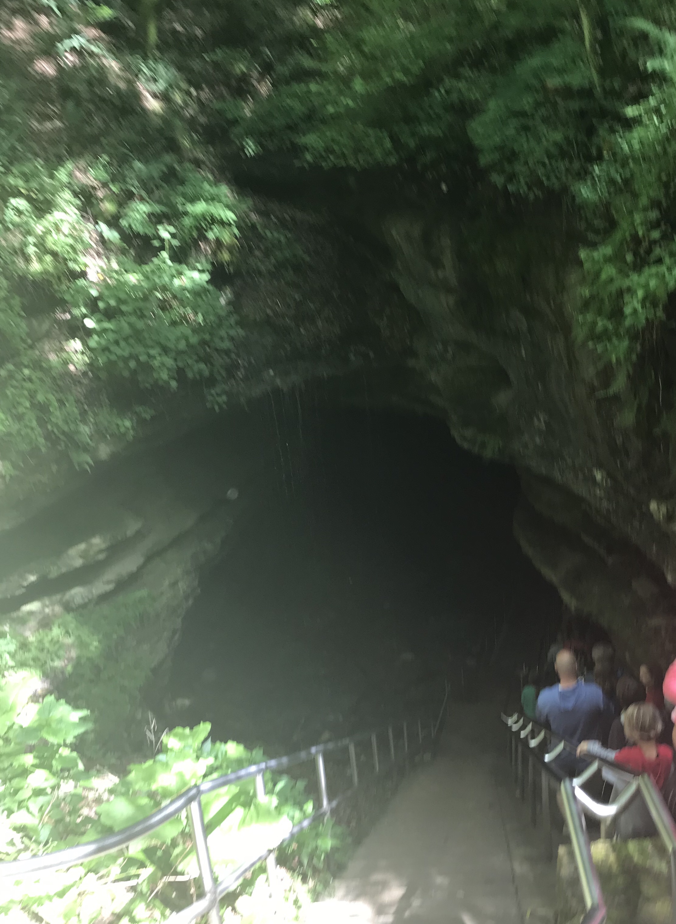 The earliest tour available was a three and half hour wait time. We took the time going through the interactive displays and watched a short movie about the cave. We took advantage of a break in the weather to have a picnic lunch and to go on a hike down to the Green River. I don’t recommend this hike after a rain. The rocks were slippery. Grammi slipped and fell right on her butt. She injured her wrist and shoulder and I could tell she was in pain. Luckily she was able to get up and walk back up the hill. It was steep and strenuous and I ended up sopping wet from exerting myself with the humid conditions. I bought a souvenir tee shirt so I would have a dry shirt to wear inside the 54 degree cave. Grammi took a couple ibuprofen and said she was good to go. She’s a tough girl.