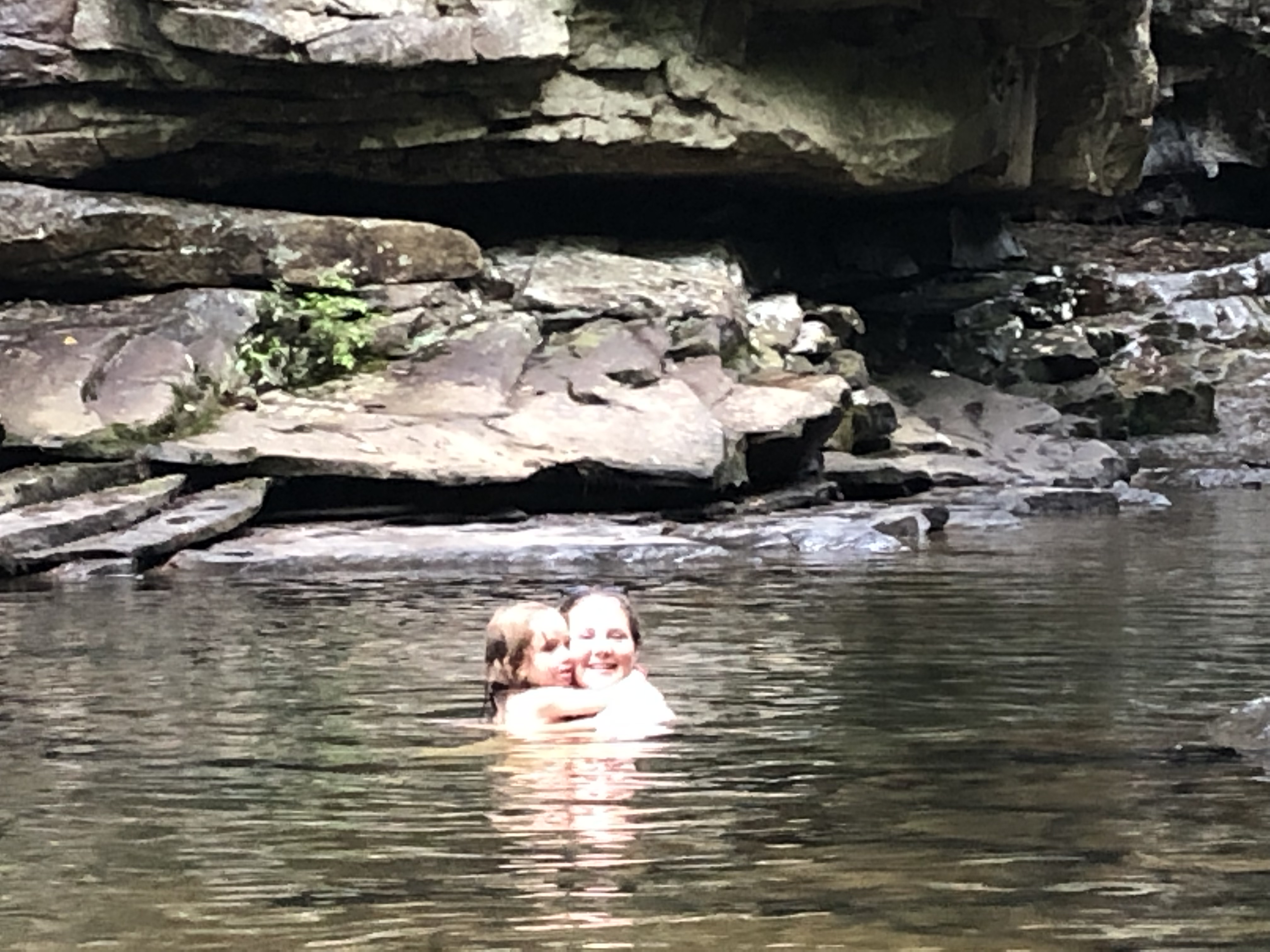 After setting up, grammi tried calling Amber but did not get through so we used the “find my friends” app on the i-phone to locate her. It led us to a congested parking area at a swimming hole. Our timing was perfect as someone was leaving as we arrived opening up a parking spot for us to grab. It quickly became apparent why this area is so popular. Here was a large level area with a grass lawn and flat rocks next to a bend in a creek. The creek is deep enough to allow the brave to jump from the rocks on the opposite side.