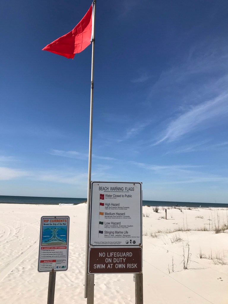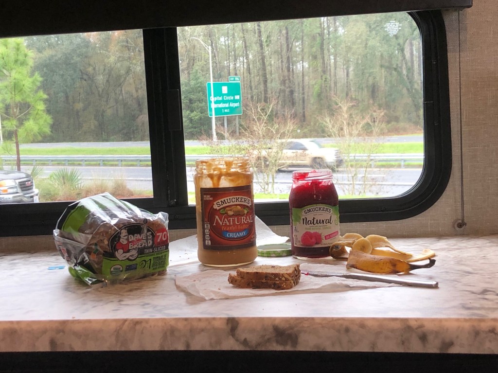 A wet and windy day made for a somewhat stressful drive to St. Andrews State Park. It wasn’t so much the rain as it was the 30 – 35mph wind gust. We stopped for lunch at a rest stop on I-10 and another RVer in a class C mentioned his struggles with the wind which made me feel a little better knowing that it wasn’t just me. Further down the road, our WAZE app alerted us of a “crash ahead”. We pulled off at another rest stop where I talk to a guy that said a semi-truck had turned over on it’s side and was blocking all westbound lanes of traffic. I’m not sure but I wouldn’t doubt if the wind had something to do with it. We rerouted and took the next exit to avoid the backup. Chalk one up for WAZE.
