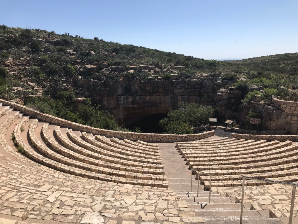 We drove back up to the amphitheater at the Carlsbad Cavern entrance just before sunset for what turned out to be an incredible experience and the highlight of our stay. Grammi read that a colony of Brazilian free-tailed bats reside in the cave from spring through fall and we should not miss the nightly out-flight event.