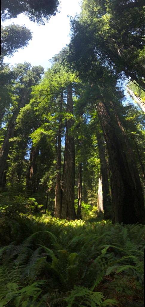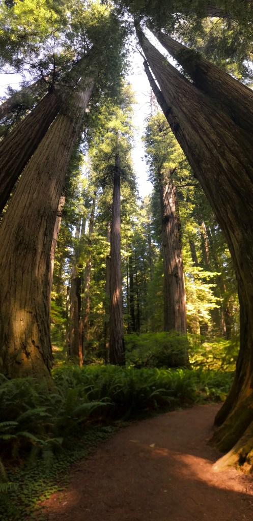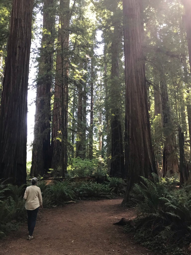We took a drive after unhitching the camper. We wanted to do a little recon and explore Crescent City, hopefully finding a service station, grocery store and a Walmart; places we will need later in the week. The winding road descended through a shaded forest of old-growth redwood trees. Giant trees inches away from the road towered up and out of sight. One curve after another, grammi and I would exchange wows. “Wow! Look at that one.” “Wow! Did you see that one?” We were awestruck.