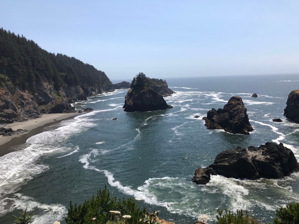 The next day was a beautiful clear day with mild temperatures. Perfect for a drive north on the 101 to Oregon, where there are miles of shoreline featuring rugged cliffs, secluded beaches, sea stacks and hundreds of small islands. We focused our attention on a 12 mile section located between Brookings and Gold Beach known as Samuel H. Boardman State Scenic Corridor. Named in honor of Oregon’s first park superintendent, this picturesque corridor can be experience by either spending a day hiking this segment of the Oregon Coastal Trail or by stopping at the many parking areas to explore its features. This stretch of highway features one turnoff after another.