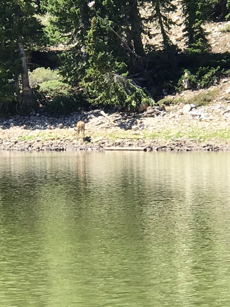 We spent a few minutes sitting on a rock by the lakeside. The cloudless azure sky contrasted beautifully with the shadows cast by the gray jagged rocks on Wheeler Peak. The water sourced from melted snow was cold and clear. The breeze was cool and refreshing. A deer stood across the lake chewing on vegetation growing near the bank. A strange caw from an unidentified bird caused grammi and I to look up and scan the trees. This peaceful scene is what motivates us to hike the trails in the many parks and forest.