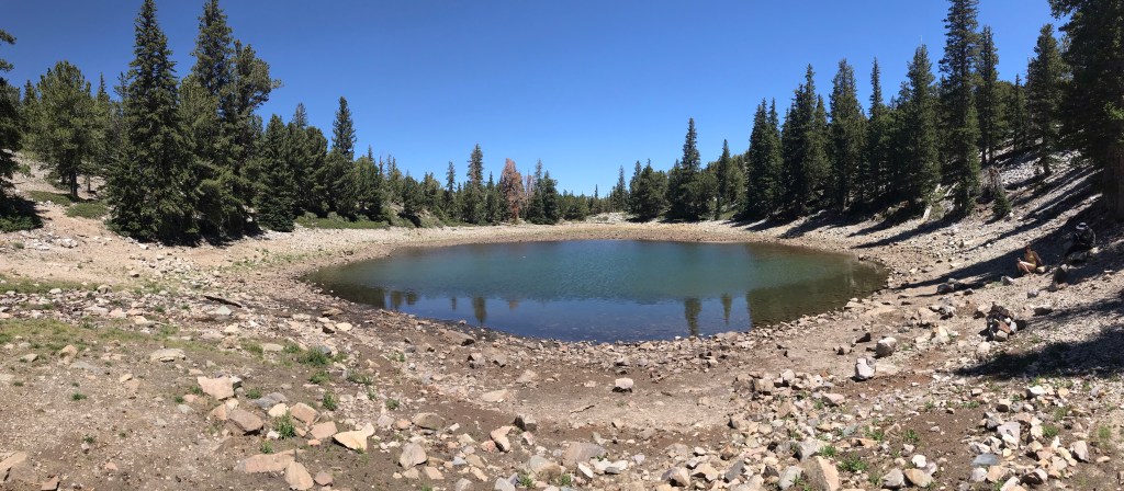 Wheeler Peak at 13,065 feet high is the second tallest mountain in Nevada. Hiking to the summit is a challenging eight mile round trip with over three thousand feet of elevation gain. We did not attempt this. Instead we hiked the Alpine Lake Loop Trail. It is 2.7 miles long with a modest 600 feet of elevation gain. Featuring two alpine lakes, Stella and Teresa Lakes, and grand views of Wheeler Peak as a backdrop, this hike was challenging enough at over 10,000 feet elevation. Having to stop often to catch my breath gave me plenty of opportunity to bask in the beauty.