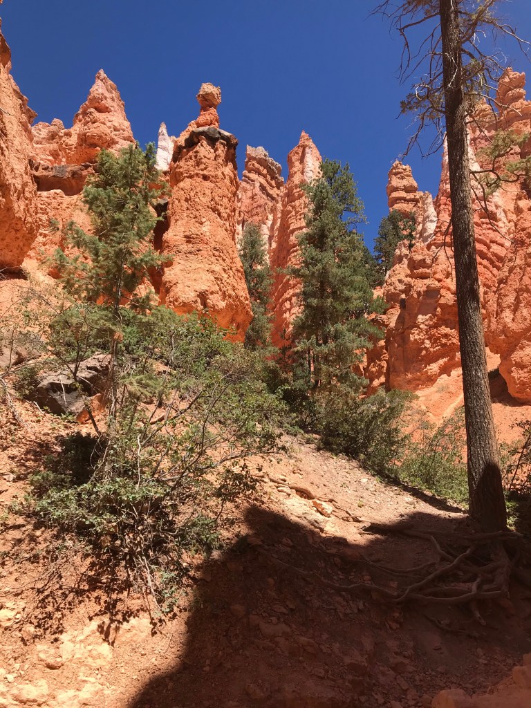 12:15 p.m. — We’re now on the Navajo Loop Trail near the bottom of the canyon. We found a shady spot about 50 yards off trail with a downed tree to sit on. We’re not the first to sit on this log as there’s a well warn path leading here. It will be a quick stop to rest and drink a little water. Thus far, this has been a really cool hike. Weaving past giant hoodoos, stooping to pass through tunnels, and peering through natural windows, has kept this quite interesting.