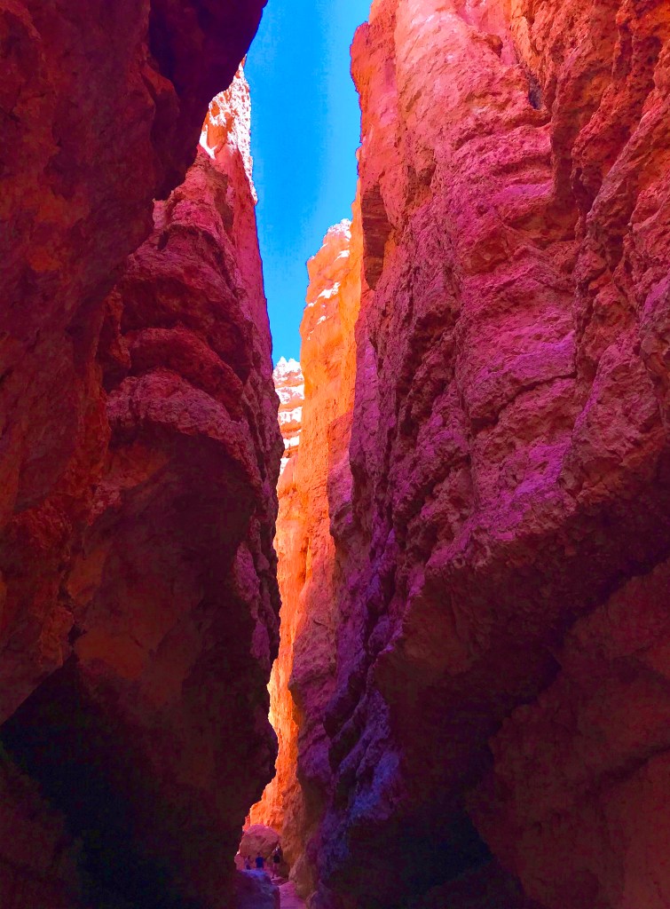 1:55 p.m. — The three of us are sitting on a bench at the top of the canyon having lunch. What a beautiful hike! Honestly, I was a little worried about climbing out, but the scenery was so amazing that I barely noticed the effort. Every where I looked, every turn along the trail revealed something new. Ascending the section known as Wall Street was like being in a narrow slot cannon. The reflected light from the sun was truly spectacular and made for amazing pictures. Even the famous switch-backs up the canyon were fun.