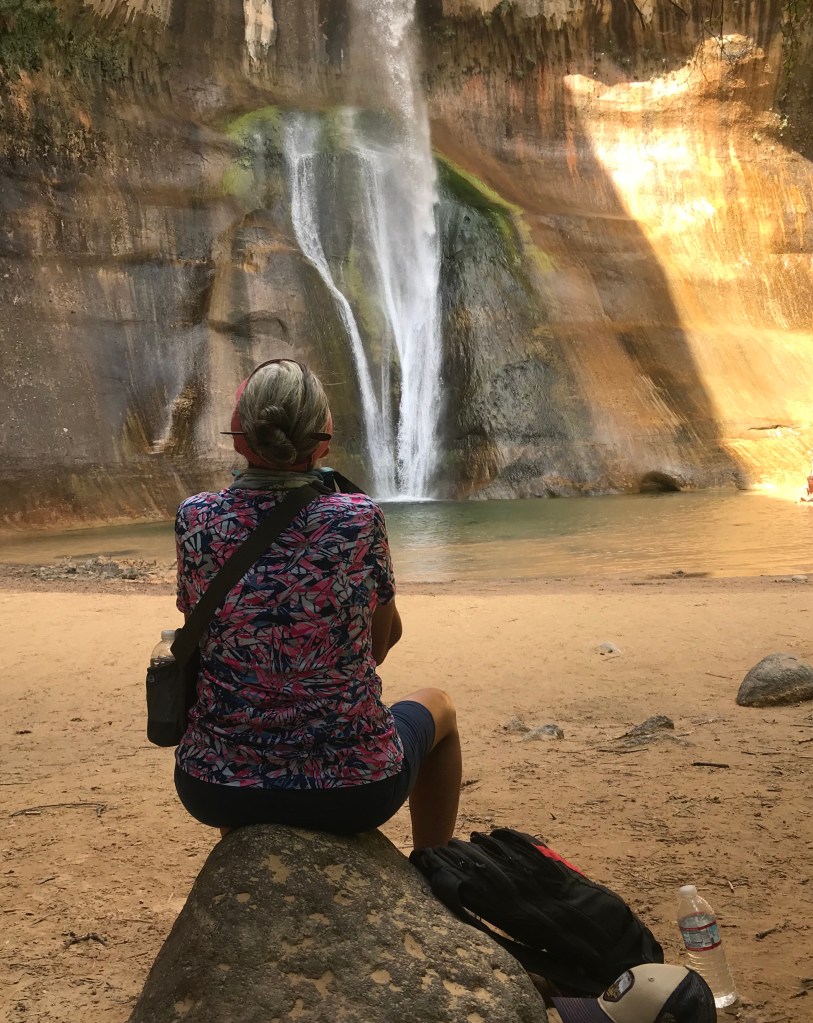 12:57 p.m. — I’m sitting on a large rock eating a sandwich. Shanna and Grammi are sitting next to me. We love finding beautiful settings to have lunch and this place fits the bill. In front of us is a spectacular waterfall. Though we’re not completely alone, I think this is as close to a secluded waterfall as I’m going to find. Hidden at the end of a ravine, Lower Calf Creek Falls drops 126 feet into a large pool suitable for swimming. Trees and other plant life flourish in this damp environment. A cool mist from the waterfall and the abundant shade from the trees create a wonderful oasis.