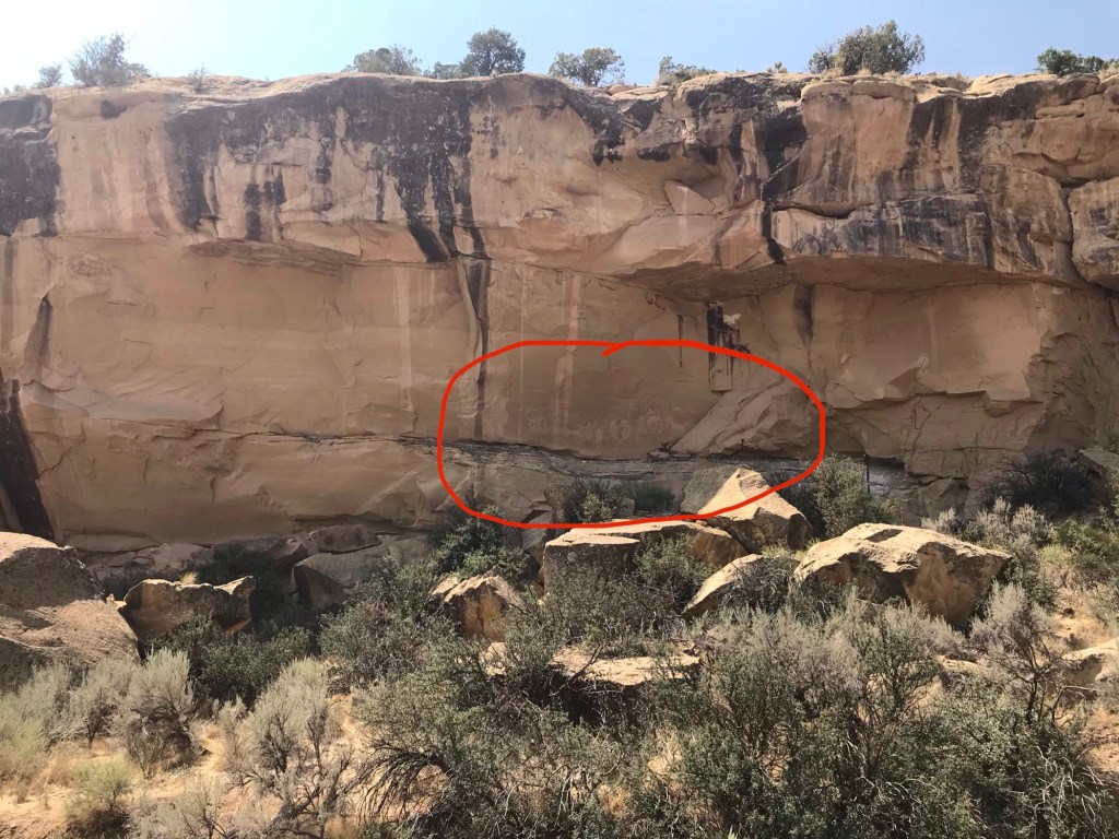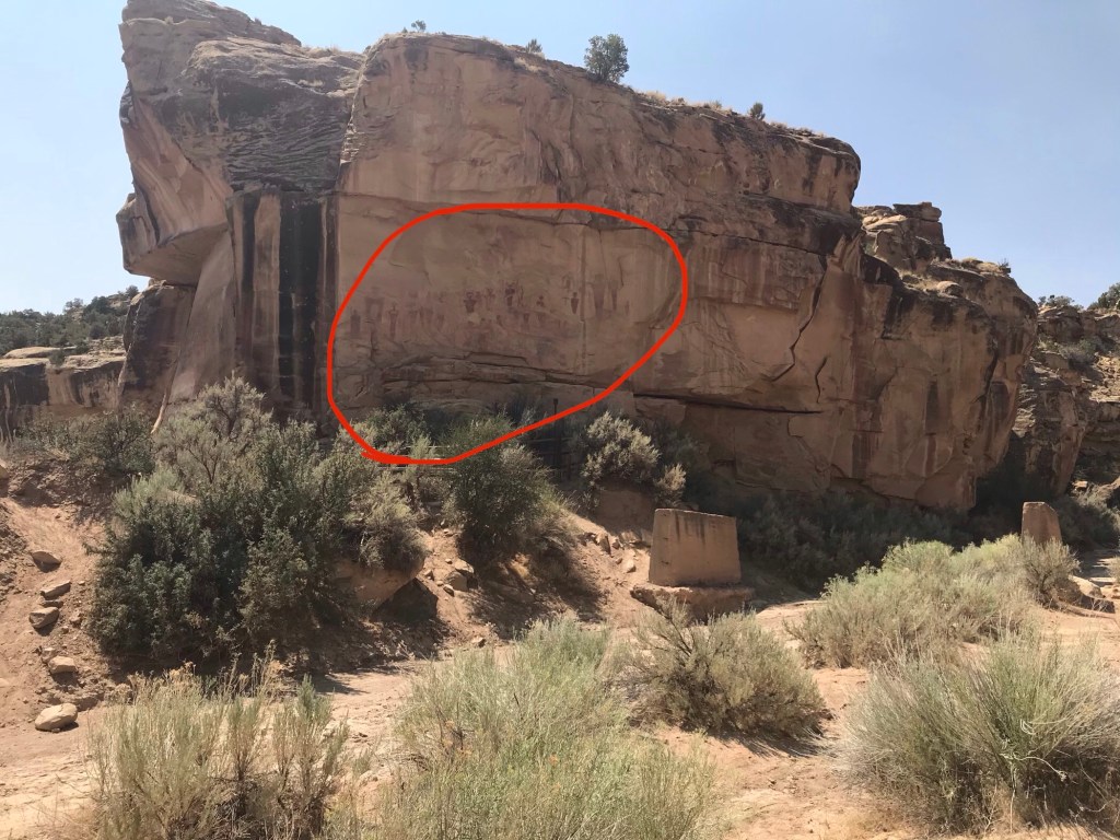 Using a hand-drawn map provided by our campground, we drove into the canyon for about 3½ miles where we found a parking area. At the parking area was a pit toilet, the only such facility we found while exploring the canyon. There were footpaths going to the cliff walls where one can get a closer look at the rock art panels. Very little information was posted. The limited number of signs we saw were faded and unreadable. The paths to the cliffs just meandered haphazardly.