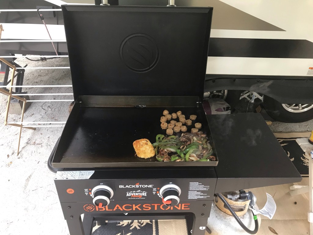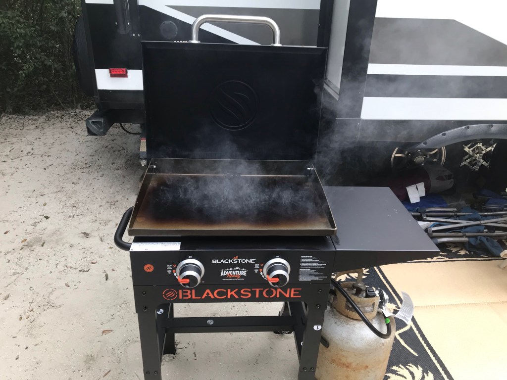 Even before we bought our camper in April of 2019, we were hearing all about the Blackstone Griddle from the different RV forums we follow. The Blackstone Griddle, if you’re not familiar, is a gas grill with a heavy steel flat top cooking surface similar to what you would see at a fast food diner. The portable versions are said to be a great accessory for a RV.