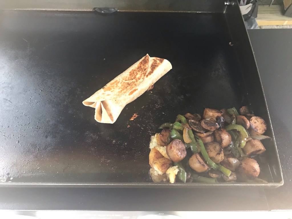 The first thing on the griddle was green peppers, onion and mushrooms. I love the aroma of that combination as it reminds me of my days at the state fair. I added a plant-based sausage and rolled it in a whole wheat tortilla. Yummy, not too bad. Over the next few days we cooked nearly all our meals on it. We especially loved the fried potatoes with just the right amount of brown crispiness. We even discovered it was perfect for reheating leftover pizza. We loved the crispy crust from the griddle.