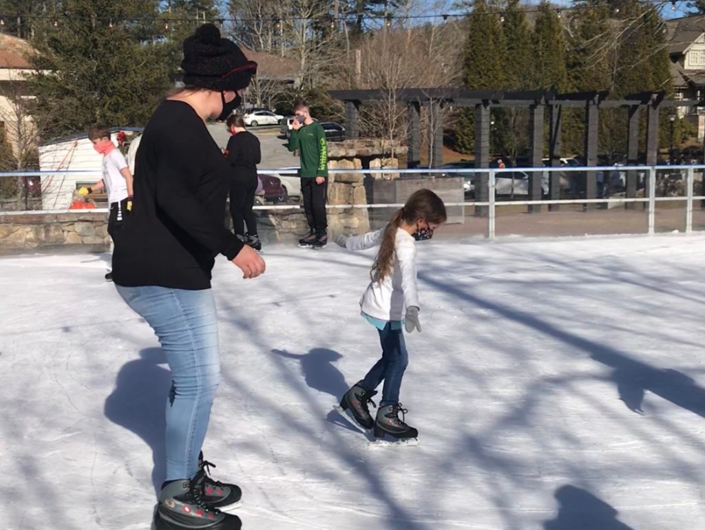 Our granddaughter, Ivy, was so excited to learn we were taking her ice skating. Located in downtown Highlands was an outdoor skating rink. It was her first time on the ice and she was eager to learn how. The admission fee included skate rental and one hour on the ice. Her mom accompanied her on the ice while grammi and I played in the snow with two year old Eliza. Eliza needed no encouragement to throw snowballs at her grampa.