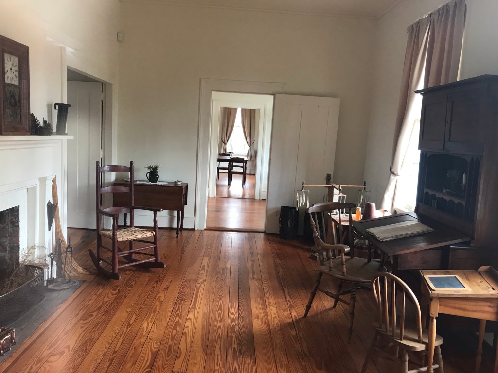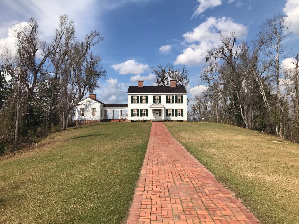 Setting high atop a bluff overlooking the Apalachicola River, is an antebellum plantation house built by Jason Gregory in 1849. This southern mansion was abandoned during the Civil War and fell into disrepair. In 1935, the Neil Lumber Company donated it to Torreya State Park, and the CCC moved the house piece by piece across the river and reassembled it at its present location. Daily tours are available during non-COVID times, but we learned the tours would be temporally closed during our visit.