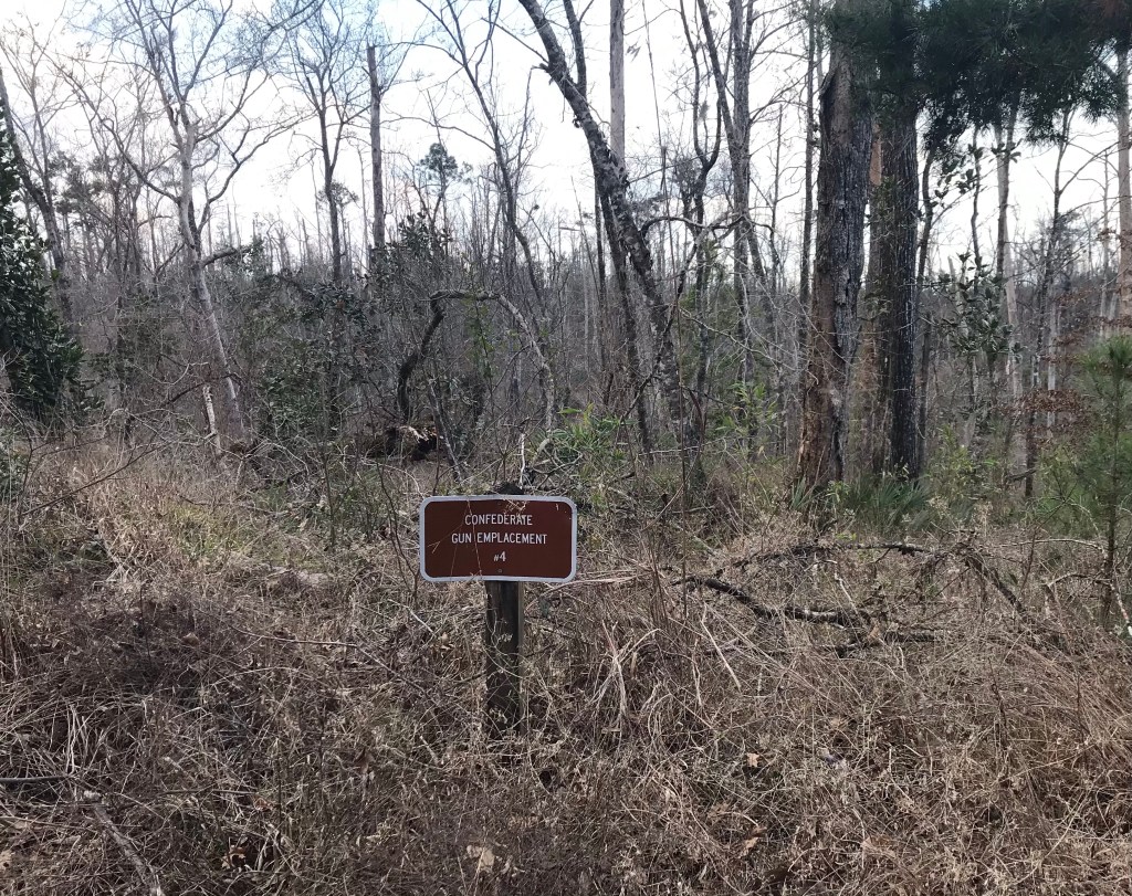 Near the Gregory House we found the trail to the Confederate gun emplacements. It was another short hike, but be aware it is a lot of ups and downs across the ravine. The shrubs and undergrowth cover the pits that once housed the cannons. One would have to use their imagination to visualize what this may have looked like. Signs and story boards along the trail help to explain the layout.
