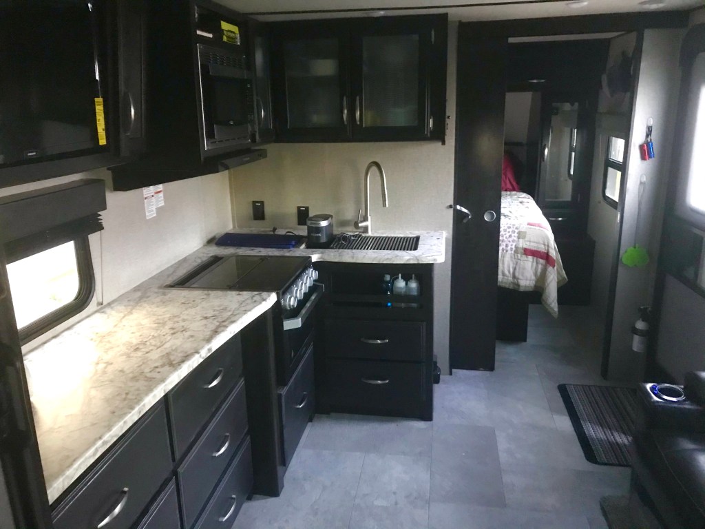 • Grammi loves all the kitchen countertop space. There is room to set out the Berkey, coffee maker, toaster, and the Instant Pot, and still have room for meal prep. There is overhead kitchen cabinets and nine drawers under the counter that provides enough space for Grammi to pack everything except the kitchen sink (that was already included). Finding another travel trailer with this much counter space and kitchen storage would be difficult for this size camper.