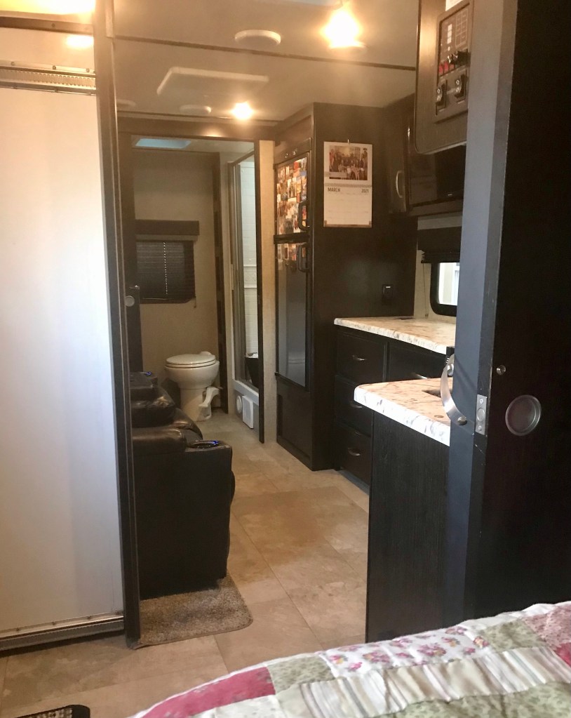 • Being able to access the entire trailer without putting out the slide is a big plus for us. Maybe not a big deal for some, but we love being able to take a break from driving and pull over to use the bathroom, make lunch, or recline back in the chair to rest the eyes a while without having to bump out the slide. We also like that we can use our own bathroom when we stop for fuel. Additionally, some narrow campsites will not accommodate campers with slides. That is not a problem for us. Sometimes, we never bother putting the slide out if we are only staying for a night or two.
