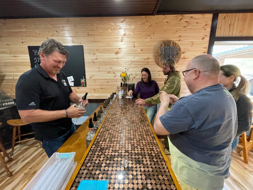 Sampling Spirits at the Tall Pine Distillery — Located across the state line in Missouri, we bellied up to the bar at Tall Pine Distillery for a tasting of flavored moonshines. The owner, Joe, poured us each a small taste of the various flavors like apple pie, blueberry, and cinnamon-vanilla describing what each is best mixed with. Regardless of the flavor, there was no disguising the distinct overpowering flavor of the corn whisky.