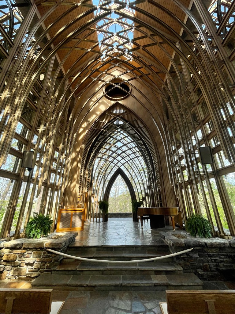 A place we stopped while hunting mushrooms was the grounds of the Mildred B. Cooper Memorial Chapel located in Bella Vista. Situated on a hill over looking a lake, the unique architecture of this non-denominational chapel is a popular wedding venue.