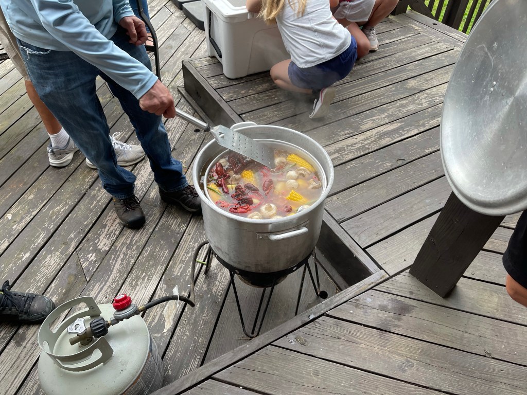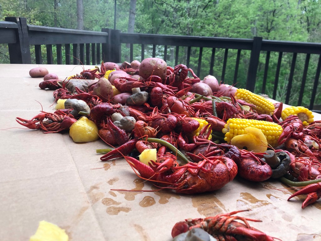 An Old Fashion Crawfish Boil — How many mud bugs can you eat? I think I set a personnel record but I have no way of verifying as I did not keep count. Suffice it to say, it was so good I found it hard to stop eating. A crawfish boil is a social event. The spicy boiled pot of crawfish, potatoes, corn, andouille sausage, mushrooms and green beans is spreads across the table where folks stand elbow to elbow and eat with their fingers. Bryan’s brother hosted the event and invited family and friends for good eats and good times.