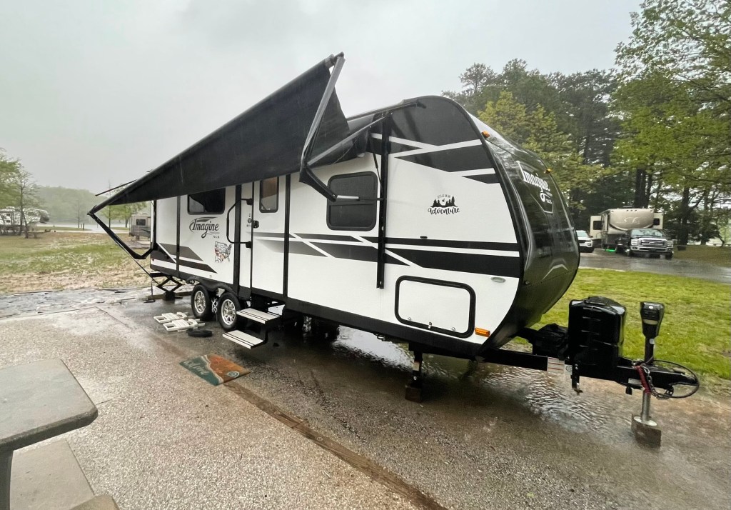 On what was to be our final night at Horseshoe Bend Campground, we arrived back at the camper late and went straight to bed. At dawn the next morning a strong storm passed over. Hail pitter-pattered on the camper. Strong winds blew across the lake and hit us broadside. We had no protection. Oh no! We heard it and jumped up as quick as we could. We had left the awning out. Not all the way out. Just far enough to cover the slide out. The fierce wind blew the rain sideways. Like a hurricane the howl was deafening…and scary. It was so strong I could not push the door open. It did not matter, it was too late and the awning was destroyed.