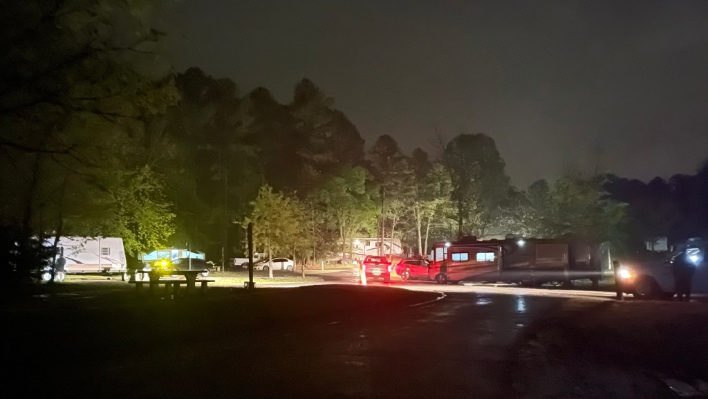 Later that night, around 10:00 p.m. we got a stern knock on the door. It was a park ranger telling us to evacuated the site because of rising flood waters. We were already hitched up, so we were out quickly to higher ground.
