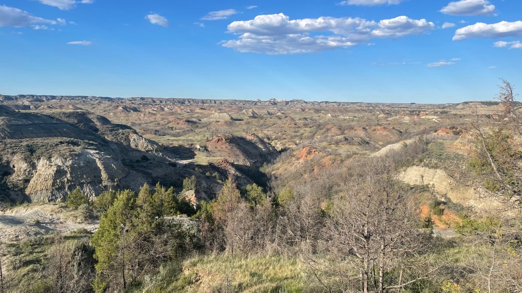 The park has evolved through the years and now includes a North Unit 75 miles from Medora. During our stay, we visited both the North and South Units. A third Unit, Roosevelt’s Elkhorn Ranch, requires a drive over a rough unpaved road. Four-wheel drive high clearance vehicles are recommended for going to this part of the park but it is not required. Checking with the park staff at the visitor center for current road conditions is a good idea before heading out to this area. We did not feel up to driving the dirty, dusty road at the time, so we skipped this part of the park. We didn’t miss much else.