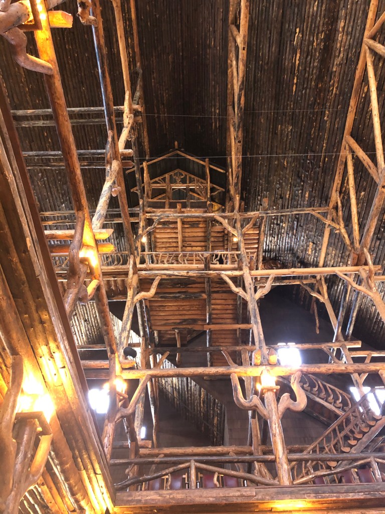 We walked to Old Faithful Inn. It was open; the visitor center was not. A national historic landmark built from 1903-1904 with local logs is considered to be the largest log structure in the world. In the lobby, a massive fireplace made from local stone towers high above. It was impressive.