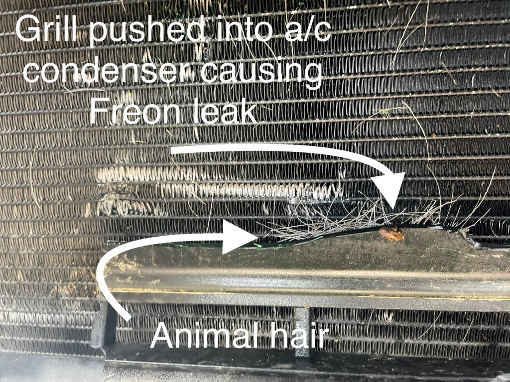 Traffic was whizzing by only inches from us. I told grammi, “let’s hurry to get somewhere safer.” I watched the gauges as we drove on. Could the radiator be damaged? I wasn’t sure. Everything remained normal so I keep on going to the campground. Soon the warm air coming from the air conditioner vents told the story. The cloud was not from the radiator; it was from the air conditioner’s condenser coil.