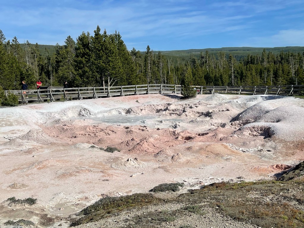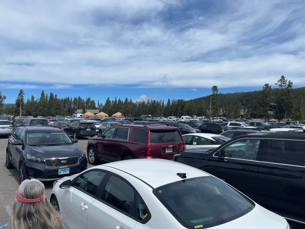 There wasn’t a traffic backup getting into Old Faithful, but finding a parking spot was a challenge. We circled through the lot a couple of times looking for a spot. Finally, we saw a few spaces on the far edge. As we walked through the parking lot toward the geyser basin, we saw the very top of Old Faithful erupt over the trees and heard the cheers from the crowd. It was over before we got there. People were walking away. That meant we would have to wait probably an hour and a half before the next eruption.