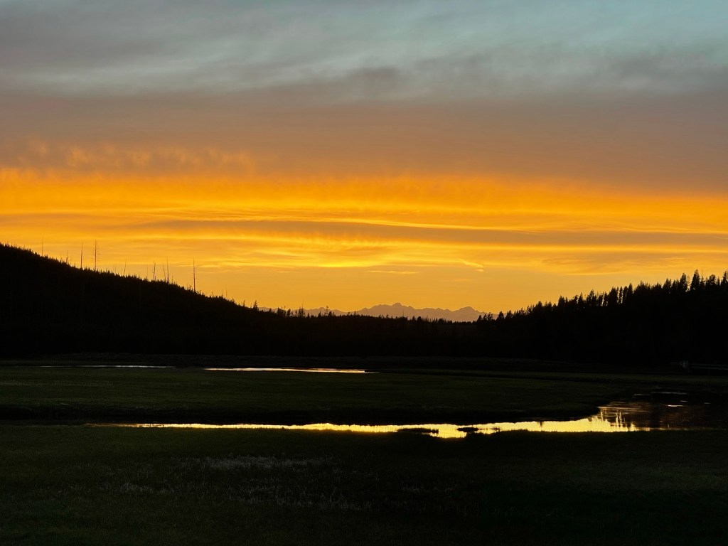 As we drove out of the park for the last time on this trip, we were gifted with a gorgeous sunset. We had to stop to take a few pictures. It was a fitting end to a whirlwind six days. The enormity of this park makes it impossible to see it all in one lifetime, let alone six days, but that did not keep us from trying. We will forever remember our time here. The grandeur of Yellowstone inspired us. We have to come back here someday — hopefully soon. Maybe stay a month or two…or three. Just a dream? I don’t know. We’ll just have to see.