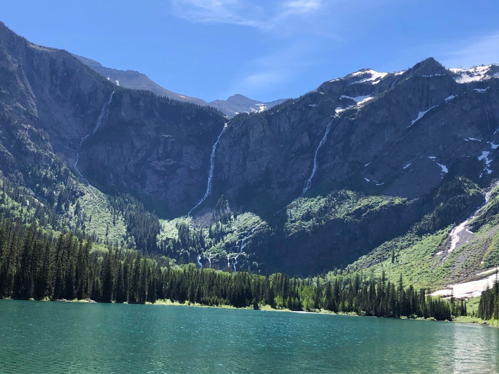 The hike to Avalanche Lake was magnificent. The 6-mile out and back trail started by paralleling Avalanche Creek. The sound of the cascading water echoed through the forest. We set a steady pace as we moved through the trees and up and down the mountain side. Finally, Avalanche Lake emerged. Everyone had the same reaction —WOW! It is hard to describe just how beautiful. We could see every detail in the bottom of the lake through the clean, clear glacier water. Across the lake were the mountains with seven waterfalls. I never imagined I would ever see seven waterfalls from a single location but the melting snow and ice made this possible. Shanna and Bobby took off their hiking boots and waded out in the water. “It”s cold”, they would say. Grammi and I sat on a fallen tree. It was a heavenly place and we wanted to take it all in.