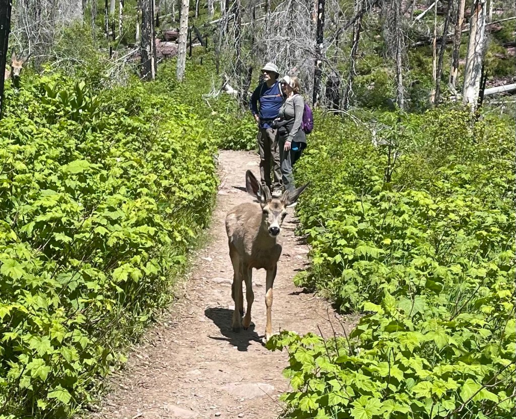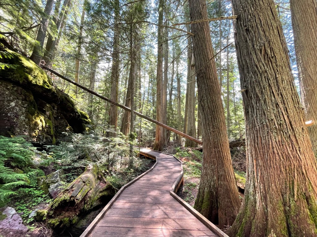 Day 7 – This is our last day in Glacier. We went to the ranger station to see if the Going-To-The-Sun-Road was open yet. It was not. So we spent our day on the section of the road that was open. We stopped at many of the pull-outs on the road and lingered to enjoy the scenery. We hiked the Trail Of The Cedars — an easy one mile hike through huge old growth cedars that crosses a bridge over Avalanche Creek. We spotted a fox near its den. We picnicked on the shore of Lake McDonald.