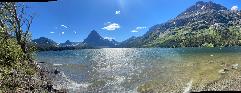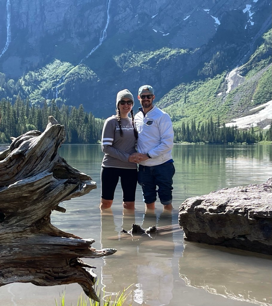 “We woke up early to go find my parents at their campsite and immediately heard a loud noise coming from the car. Bobby jumped out to check, and sure enough we had a flat tire, most likely from the dirt road the night before. We immediately started working to change it and realized we were missing some crucial parts. Dozens of people stopped to help, but no one could lower the spare and no one had service to call for help. I ran down the road to a restaurant with a landline, which included a call to my parents and roadside assistance. Mom and Dad arrived before the tow truck, which actually never came. My dad used his truck to pump up the tire so we could move safely off the road back to our cabin, where the guys removed the flat. We headed in to town an hour down the road to buy a new tire, and stopped at a local brewery. I think the guys enjoyed this more than anything else on the trip. When we returned, the guys rotated and changed the tires. We had a little bit of daylight left and headed to Bowman Lake, our first glimpse at the park. It was UNREAL. The pictures look like we are in front of a green screen, but I assure you we’re not!! All in all, it was a great day, making the most of the moments and grateful for kind people, and that it wasn’t any worse than it could have been.”