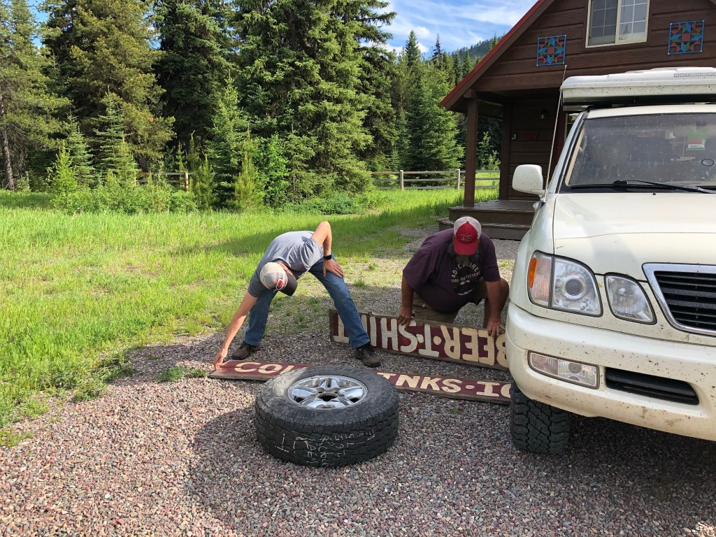 Day 3 – We were awake early in anticipation of Shanna and Bobby’s arrival. It wasn’t until around 10:00 a.m. that we heard from Shanna. I was right. They didn’t get to their cabin until after dark and thought it best to wait until morning to come see us. But now, they are stuck on the side of the road with a flat tire on the rental car and can’t get the spare loose to change the tire. They were waiting for a tow truck. We found out they were on the dusty, bumpy dirt road to Polebridge, so we headed out to find them. They were so happy to see us when we arrived. We got extra hugs. The day did not go as planned but we made the best of it. Here is what Shanna wrote on her social media about the day.