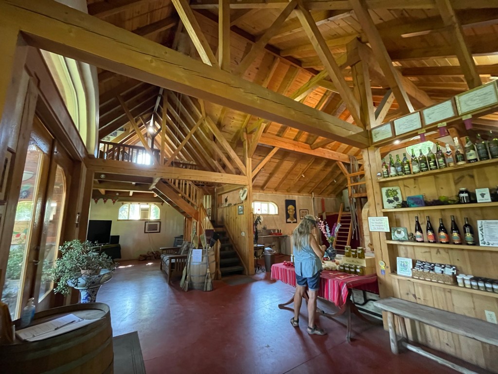 We came to a sign on the road showing us where to turn. Down an unpaved dusty road were more signs pointing the way, without which I’m sure we would have gotten lost. Soon an oasis emerged with green grass, lush trees, grape vines and a vegetable garden. The Wine shop and tasting room is a grand timber frame building. It was a lovely place.