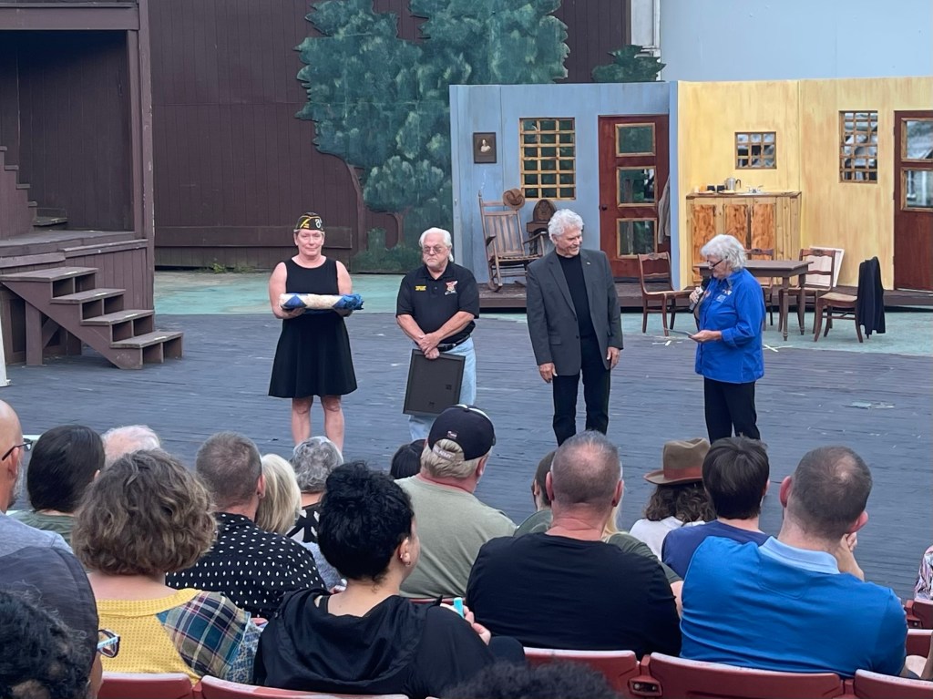 Mr. Hickam, a native son of West Virginia, was present at the show. He was invited on stage prior to the performance to address the crowd. His words drew laughter and applause as he told stories about his fascination with Sputnik when he was a kid and his time spent in Russia when working for NASA. He ceremoniously presented the ‘Key of Coalwood’ to the mayor of Beckley for their generous contribution toward the play’s production. Then Mr. Hickman was presented a Quilt of Valor for his military service during the Vietnam War.