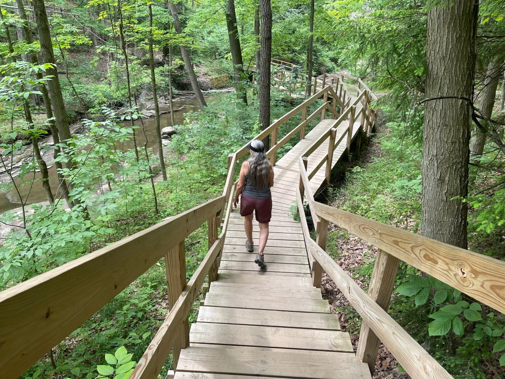 Brandywine Falls, one of the park’s most iconic landmarks, did not disappoint. The hike to the falls is relatively easy, if you don’t mind a few stairs. The 65-foot waterfall is breathtaking, and the boardwalk provides great vantage points for photos. We sat on a bench overlooking the falls. We watched a constant flow of people walk up, take a photo, then walk away. We stayed awhile and listened to the sound of rushing water and felt the cool mist on our faces.