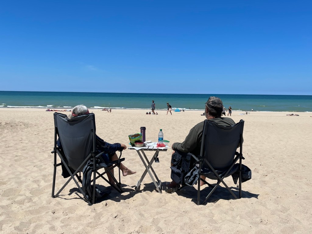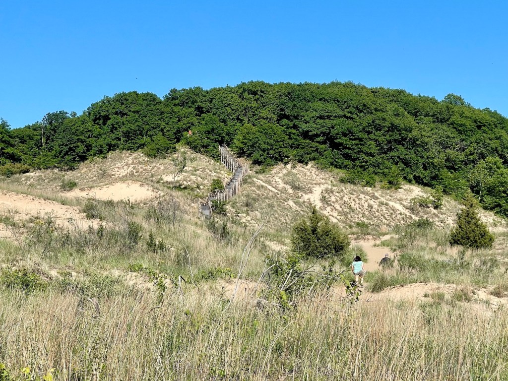 Our final stop for the day within Indiana Dunes National Park was West Beach. With a modern bathhouse, sandy shoreline, and lifeguards, it stands as a popular beach spot. It is also the location of Diana of the Dunes Dare, featuring a challenging climb of over 250 stairs and a mile-long boardwalk traversing some of the park’s tallest dunes. Did we accept the challenge, you wonder? Perhaps if it had been our first stop of the day, but we were feeling weary by this time, tempering our spirits. Nonetheless, we savored one last moment by wading into the waters of Lake Michigan one more time before heading back to our campground.