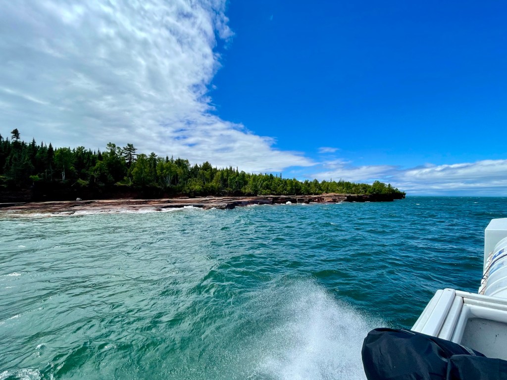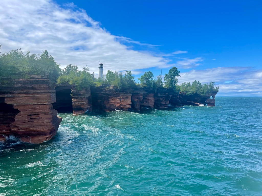 As we cruised away from Bayfield Pier, the sun peeked through scattered clouds, casting shimmering reflections on the water. The captain navigated the boat through the heart of the archipelago, closely passing the rugged shorelines of many of the islands. We were treated to breathtaking views of the sea caves, sculpted by centuries of wind and waves, and the iconic lighthouses standing as sentinels on the islands.